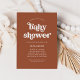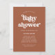 Diese einfache und leise, geschlechtsneutrale Babydusche mit weißer Retro-Typografie auf neutralem boho terracotta-Hintergrund.