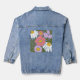 Eine moderne, wellig-schimmernde Blume mit Weiß-, Lila- und Korallenblüten verleiht dieser Denim-Jacke ein Retro-Ambiente, moderne Hippie und Bohemian. Das Design kann so bearbeitet werden, dass jedes farbige Element in den eigenen Stil Anzug werden kann und es für Sie völlig einzigartig macht.