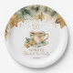 Weihnachts Winter Brautparty Tee Party Geschirr personalisiert Party Teller, Aquarelltasse Tee mit Schneeflocken Poinsettia und Kekse Kiefern Äste moderne lässige Schriftart Winter Brautparty Teller