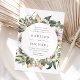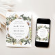 Elegante, einzigartige Blumenzettel mit Ihren Hochzeitsdetails, umgeben von weißen Blume und üppigem Grün, Beige und Braun. Die Einladung kehrt zu einem hellbeigen Aquarell-Hintergrund zurück.