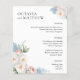 Elegantes botanisches, schicke Hochzeitsmenü mit Blumenakzent an den Ecken mit Ihren Namen in eleganter Serif fett und einem Bouquet aus weißblauen und rosa Rosen und Pfingstern in sanften Wasserfarben. Persönlich gestalten Sie Ihr Hochzeitsessen mit den Details unten. Die Vorlage bietet 3 Überschriften und 3 Leerzeichen für benutzerdefinierten Text und Platz für die Namen von Braut und Bräutigam. Benötigen Sie weitere Optionen? Bitte kontaktieren Sie mich, ohne zusätzliche Kosten! Diese Speisekarte kann für Hochzeitsfeiern, Proben oder jede Veranstaltung verwendet werden.