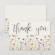 Wildflower-Dankeskarten. Dieses minimalistische und elegante Design ist perfekt für Brautduschen, Babypartys oder jeden, der einen einfachen, zeitlosen Stil liebt. Die Vorderseite zeigt einen elfenbeinfarbenen Hintergrund mit "Danke" in einer eleganten Schriftart, mit einer minimalen Anordnung einfacher Wildblumen am unteren Rand in gedämpften, eleganten Tönen von Rosa, Elfenbein, sanftem Gelb und subtilen neutralen Akzenten mit zarten grünen Blättern für einen raffinierten, luftigen Touch.