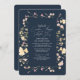 Eine Hochzeitseinladung mit moderner Touch. Die Hochzeitsinformation über einen marinen Hintergrund ist von einer Wildblume mit weichem Rosa und blassgelbem Rahmen umgeben. Ideal für den Frühling, Sommer für den Herbst.