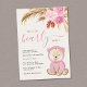 Boho Mädchen Dusche Einladung mit einer Aquarellbild eines niedlichen Teddybären, einem Strauß von Taupe und Terracotta Pampas Gras und rosa Blumen und "We Can Bearly Wait" in einer Mischung aus einfachen Typografie und einem stilvollen rosa Swash-Skript.