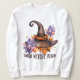 A whimsical boho-style illustration featuring a witch hat adorned with autumn leaves, purple crystals, and soft flowers. The phrase “Boho Witchy Vibes” captures the magical and free-spirited essence of the design, blending mystical charm with bohemian flair.