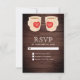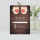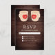 Elégante carte RSVP avec de belles tasses à café monogramme avec typographie moderne contre un arrière - plan en bois de grange.