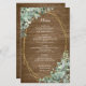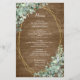 Les options de menu mariage sont encadrées de bouquets de verdure d'eucalyptus sur un cadre géométrique doré. L'arrière est orné d'un arrière - plan en bois rustique.