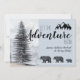 L'aventure vous attend, les bois rustiques portent une faire-part de grossesse dans une douce teinte gris pastel bleu, avec un majestueux sapin forestier et une silhouette montagneuse. Personnalisez pour votre baby shower. pour baby shower garçon ou fille. Voir la suite complète de produits pour cette conception à l'adresse suivante : https://www.zazzle.com/collections/adventure_begins_woodland_bears_baby_suite-119679877296535208