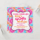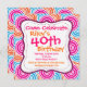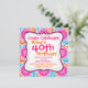 Fett aquamarines blaues, heißrosa Fuchsienmuster und orangefarbenes, zentriertes Kreismuster Einladungsvorlage. Diese Einladung wird als Party Einladung zum 40. Geburtstag gezeigt, aber diese Vorlagen der niedliche Geburtstag-Party Einladung können leicht für Kinder oder Erwachsene genutzt werden oder können für jede Art von Party oder Veranstaltung angepasst werden. Füllen Sie einfach den Text mit Ihren eigenen Party-Details aus. Wenn Sie gewollt haben, die Farbe des Textes zu ändern oder Dinge neu zu ordnen, verwenden Sie einfach die orange Schaltfläche "Anpassen". Die Rückseite der Einladung hat das gleiche farbenfrohe Muster wie die Vorderseite.