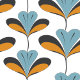 Retro-inspiriert Tapete mit fett geometrischen Blumenformen in Blau, Orange und Creme vor schwarzem Hintergrund. Ideal für moderne Innenräume, Akzent-Wände oder Statement-Stoffprojekte mit Vintagem 70er-Ambiente.