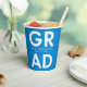 Personalisierte Abschluss-Papiertassen mit "Grad" in fett weißer Schrift mit einem blauen Hintergrund oder einer Farbe Ihrer Wahl. Personalisieren Sie die Papiertassen des Abschlusses, indem Sie den Namen des Absolventen und das Abschluss Jahr. Die blauen Abschluss-Papiertassen eignen sich sowohl für Uni-Abschluss- als auch für Highschool-Partys.