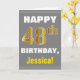 Cette simple carte de voeux d'anniversaire présente un souhait d'anniversaire chaleureux comme "HAPPY 48th BIRTHDAY, Jessica!" sur le devant, en texte gras sur un arrière - plan gris (gris). Le numéro d'anniversaire a une apparence de coloration fausse/imitation or. Le nom sur le devant peut être personnalisé. L'intérieur comporte un message d'anniversaire personnalisable. Une carte de voeux comme celle-ci pourrait être une façon amusante d'offrir des voeux d'anniversaire à quelqu'un qui célèbre son quarante-huitième anniversaire. [~Z0000283]