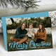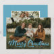 Stilvolle Urlaubskarte mit Ihrem horizontalen Foto auf der Vorderseite mit "Frohe Weihnachten" in einem fett hellblauen Schriftzeichen-Overlay dargestellt. Personalisieren Sie die Vorderseite der Weihnachtskarte des Fotos mit Ihrem Familiennamen und dem Jahr. Die Karte kehrt um, um ein zusätzliches, in Weiß gerahmtes Foto mit einem eisblauen Hintergrund mit subtilen weißen Punkten anzuzeigen.