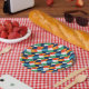 A bold, multicolour geometric abstract pattern featuring diagonal blocks of vibrant colours mixed with navy stripes. The dynamic combination of shapes and overlapping colours creates a striking, modern look perfect for prints, fashion, and home décor.