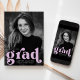 Stilvolle Graduierungsankündigungen mit dem senkrechten Foto des Absolventen mit "grad" in fett lila Schrift. Personalisieren Sie die Ankündigung des Foto-Abschlusses, indem Sie den Namen des Absolventen, Abschluss Jahr und Schule hinzufügen. Die Ankündigung kehrt zurück, um ein lila und weißes Retrobogenmuster anzuzeigen.