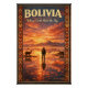 A square travel poster of Bolivia in South America, featuring the surreal Uyuni Salt Flats reflecting a dramatic golden-pink sunset sky, a lone traveler standing on the mirror-like surface, distant Andes mountains fading into the horizon, llamas grazing peacefully, and subtle patterns inspired by traditional Bolivian textiles framing the composition, bold vintage retro travel poster style, slightly faded colors, cinematic lighting, soft grain texture, balanced geometric layout, high contrast, atmospheric and artistic, with a striking headline at the top reading “BOLIVIA – Where Earth Meets the Sky” in elegant retro typography