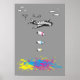 Macht Kunst nicht Krieg. Drei Kampfflugzeuge, die Spritzbomben auf grauem Hintergrund fallen lassen