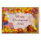 Une carte délicieuse pour Thanksgiving, avec de magnifiques feuilles d'automne, fleurs et US. Fanion. Personnalisez-le et ajoutez le texte de votre choix, très adapté à la famille et aux amis.