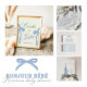 Mit sanft staubigen blauen Tönen, blauen Bögen und anmutigen Schriften verbindet dieses Design perfekt zu jedem Pariser oder Coquette-Fest.