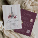 Set für eine elegante und romantische Babydusche mit dieser doppelseitigen Bonjour Bébé-Einladung von Redwood & Vine Design Co. Die Vorderseite präsentiert einen handbemalten Eiffelturm, rosa Streifen und üppige bordeauxfarbene Blumen. Im Hintergrund befindet sich ein reichhaltiger Pflaumenhintergrund mit Platz für UAWG, Registerinformationen und einem scannbaren QR-Code. Ideal für Herbst- oder Winterduschen, die ein kleines Mädchen feiern. Diese Einladung verbindet klassischen Pariser Stil mit modernem Komfort.