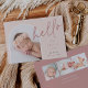 Design élégant de faire-part de naissance photo avec une mise en page unique, cette carte chic dispose d'une photo verticale en forme d'arcade sur un arrière - plan rose rose doux et poussiéreux, avec "bonjour" superposé dans la typographie de script lettré à la main. Personnalisez avec le nom, la date de naissance et les statistiques de naissance de votre nouveau bébé, et ajoutez un message personnel au dos, ainsi que trois photos carrés supplémentaires.