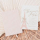 Say bonjour bébé mit dieser schicken und eleganten Pariser Babydusche. Die Lobby ist in sanften Blütentönen gehalten, mit einem Bogen gefesselt und mit modernen Schriftzeichen versehen. Sie ist perfekt geeignet, um ein kleines Mädchen im Pariser Stil zu feiern. Der Rücken ist mit klassischen, schwarzen und cremefarbenen Streifen geschmückt und verleiht ihm ein poliertes, Boutique-Ambiente mit einem Coquette-Rand.