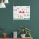 Cette affiche lumineuse et colorée dit bonjour en plusieurs langues, dont le français, l'anglais, l'espagnol, le norvégien, le gaélique, le chinois, l'allemand et bien d'autres !