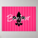 Das Wort "Bonjour", mit dem "j" mit einem Herz überzogen, ist auf einem schwarzen Fleur-de-lis-Silhouette-Set vor einem Hintergrund von dunkelrosa und hellrosa Streifen.