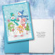 Les cinq bonhommes de neige habillés et souriants sur le devant de cette carte semblent très heureux... et pourquoi pas ? Ça approche Noël, et le ciel est rempli de flocons blancs ! Cette charmante image rétro est colorée, amusante et encadrée dans un joli turquoise. Les casquettes et les écharpes en bleu, vert, or et rouge égayent la scène, et un petit bonhomme de neige tient un petit arbre vert de vacances avec une étoile d'argent et un fond sucre de canne. Mignonne ! Le texte intérieur est entièrement personnalisable, de sorte que vous pouvez le personnaliser ou le faire dire ce que vous voulez.