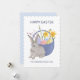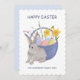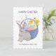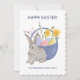 Belle invitation avec panier de pâques avec oeufs et fleurs et lapin gris.