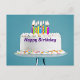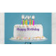 Un gâteau d'anniversaire joliment décoré avec des bougies colorées sur le dessus, dressé contre un arrière - plan bleu doux.