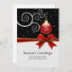 Bonnes Fêtes Ornement Monogramme Nom Modèle Flat Card est un modèle que vous pouvez personnaliser avec votre propre salutation de vacances avec votre nom de famille ou des employés d'affaires. Ornement rouge sur une branche blanche fantaisie et chute de neige dans l'arrière - plan avec l'image d'un ruban rouge. Ces cartes à plat d'accueil sont également parfaites pour les cartes de fin de année d'entreprise et de petite entreprise.