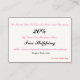 Une utilisation différente pour des cartes de visite. Angeline et Company croit qu'il faut fournir vous remercient des cartes de leurs clients et de temps en temps des figurants vous remercient de leur achat. Les cartes de visite donnent à l'entrepreneur une solution d'économie que le client peut employer ou donner loin à un ami ou à un membre de la famille intéressé. L'avant du carte de visite ci-dessous est le logo de société, dos de carte fournit tout que le client devra épargner sur leur achat net. Avec plusieurs options pour choisir du son une bêtise.