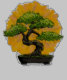 Une belle illustration d'un bonsaï assis dans un pot noir contre un arrière - plan circulaire jaune vif.