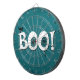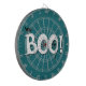 Boo! Textdesign zu Halloween mit Katz, Spinne, Eule und Spinnennetz Dekoration auf grunblauem Hintergrund.