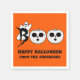 Bild eines Halloween-Geistes und "Geisterkürbisse" auf orangefarbenem Hintergrund.