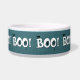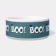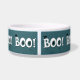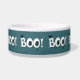 Boo! Textdesign zu Halloween mit Katz, Spinne, Eule und Spinnennetz Dekoration auf grunblauem Hintergrund.