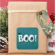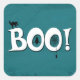 Boo! Textdesign zu Halloween mit Katz, Spinne, Eule und Spinnennetz Dekoration auf grunblauem Hintergrund.