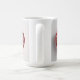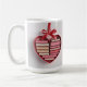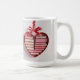This mug features a red heart-shaped gift box with a red satin ribbon bow at the top. The heart-shaped shelf contains a collection of books that are uniform in size and thickness, creating a layered effect within the heart shape. The heart is on a white background. The books are hardcover editions. The heart gift box has neat, smooth edges and a glossy finish. The red satin ribbon is perfectly tied into a symmetrical bow. The composition has a romantic, Valentine's Day aesthetic with red tones and heart shape. The mug is a classic white mug. The mug is a fifteen ounce mug. The mug is microwave and dishwasher safe.