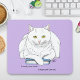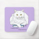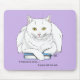 Eine weiße Katze sitzt auf einem Buch und will Aufmerksamkeit in einem lila Umfeld