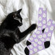 Eine weiße Katze sitzt auf einem Buch und will Aufmerksamkeit in einem lila Umfeld