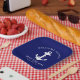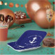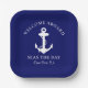 Moderne nautische Teller für Ihr Boot, die eine weiße Abbildung eines Ankeres auf dunkelmarineblau-Hintergrund zeigen. Personalisieren Sie den Text "Welcome Bard" und den Namen und die Lage Ihres Bootes in eleganter weißer Typografie.