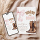 Célébrez l’anticipation du genre de votre petit avec notre magnifique jeu Boots or Bows Theme Gender Reveal Invitation. Parfait pour une soirée à thème occidental ou rodéo, cette invitation présente un bel arc rose et une paire de bottes de cowboy symbolisant le thème classique "Lui ou Elle".