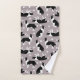 Niedliche Schwarz-Weiß-Colliese sitzen, bleibe und rollen auf grauem Hintergrund mit Pfosten, einem lustigen Hundeschema.
