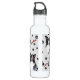 Diese Wasserflasche zeigt ein Künstlerportrait eines schönen schwarz-weißen Border Collie Hundes. Das Bild wird um den Flaschenrahmen herum wiederholt und auf einem hellblauen grauen Hintergrund mit schwarzen Pfotendrucken und weißen Knochen platziert. Auch Ihr Name oder ein anderer Text in Maronrot wird um den Umkreis herum wiederholt.