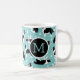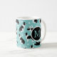 Niedliche schwarz-weiße Colliese sitzen, stehen und legen mit verstreuten Pfotendrucken auf blauem Hintergrund mit eigenem eigenen Monogramm.