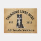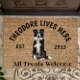 Border Collie Personalisiert Dog Liebhaber willkommen vor der Tür. Diese Begrüßungsmatte kann mit dem Namen Ihres Hundes personalisiert werden, der Slogan kann auch geändert werden oder Sie können ein Foto Ihres eigenen Hundes verwenden (stellen Sie sicher, dass es transparent ist). Text liest: Theodore lebt hier... Alle Leckereien begrüßen das Bearbeiten des Designs, um den Schriftart, die Farben und die Hintergrundfarbe zu ändern. Ein wunderbares Geschenk für ein Party, Ferien, Hundefreunde und für jeden Anlass.