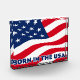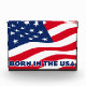 Wavy American flag with bold red and black stripes and blue stars. “Born in the USA” statement for patriotic pride. Great for Independence Day, veterans, and USA supporters.