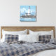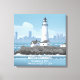 Farbenfrohes Kunstwerk des Boston Leuchtturms und der Skyline der Stadt im Hintergrund. Machen Sie eine Bootsfahrt vom Boston Harbor aus, um diesen außergewöhnlichen Leuchtturm zu sehen. Perfekt für alle, die diese fantastische Region von Massachusetts lieben.
