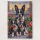 Eine stilvolle Familienszene mit Boston Terriern in einem gemütlichen Dachgarten. Mit einem stolzen erwachsenen Hund und zwei spielenden Welpen zeigt dieses Kunstwerk städtischen Charme kombiniert mit floraler Schönheit – perfekt für Hundeliebhaber und moderne Dekoration.